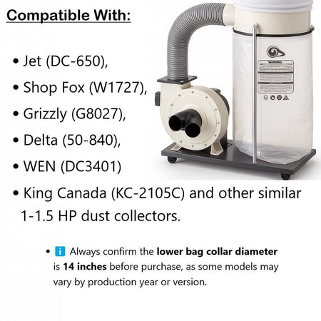 - Compatible with 16.5" diameter dust collectors such as Powermatic (1791087). Always confirm the lower bag collar diameter is 16.5 inches before purchase, as some models may vary by production year or version.