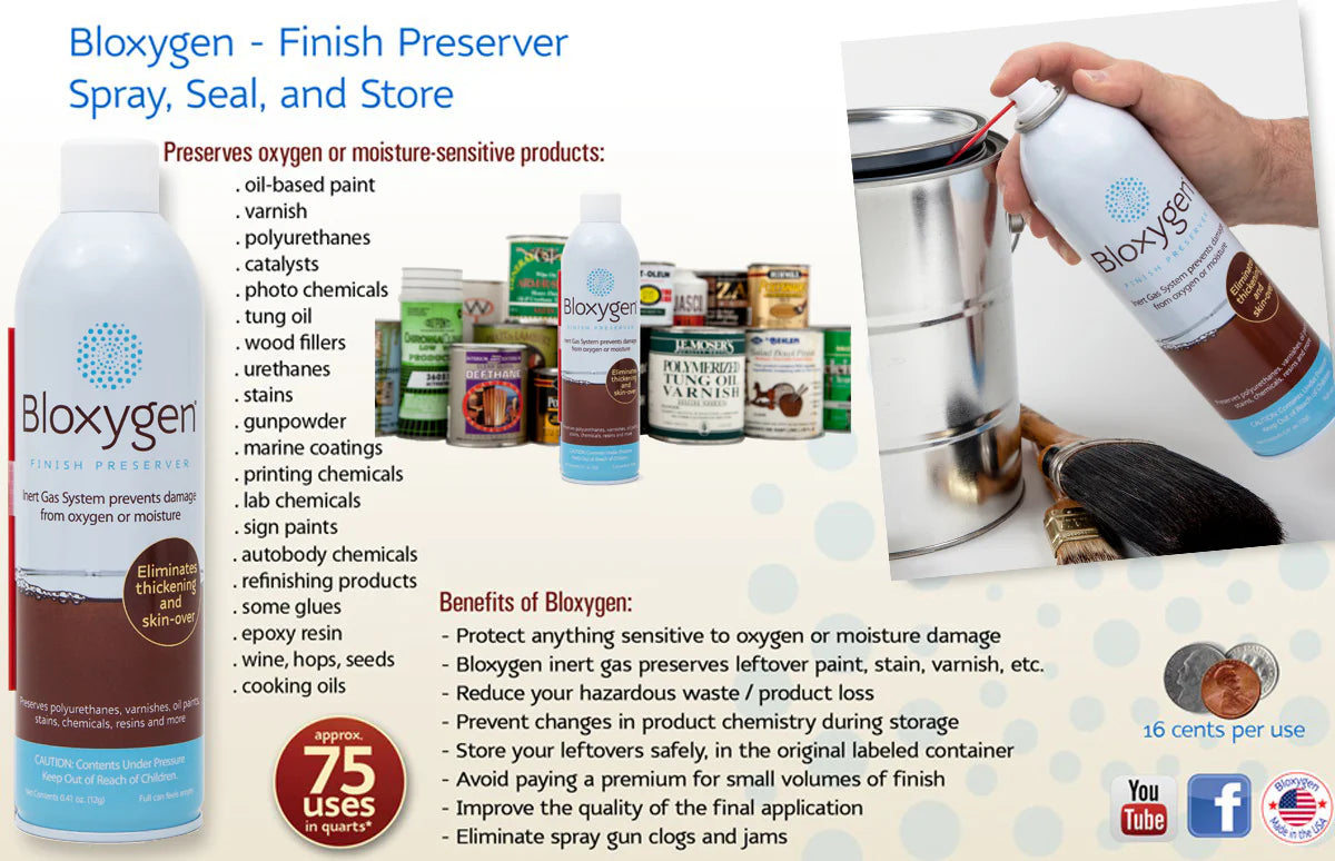 Save your leftover paints, finishes or food from getting ruined by oxygen or moisture. Simply spray, seal and store for up to 10 years. Never have hardened paint or rubbery finishes ruin your day. Safe for food, coffee, cannabis. Tested by manufacturers. Industry best practice.
